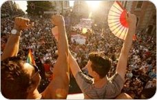 Rafa Martín con los brazos en alto desde la carroza frente a miles de personas en el Orgullo Gay de Madrid.